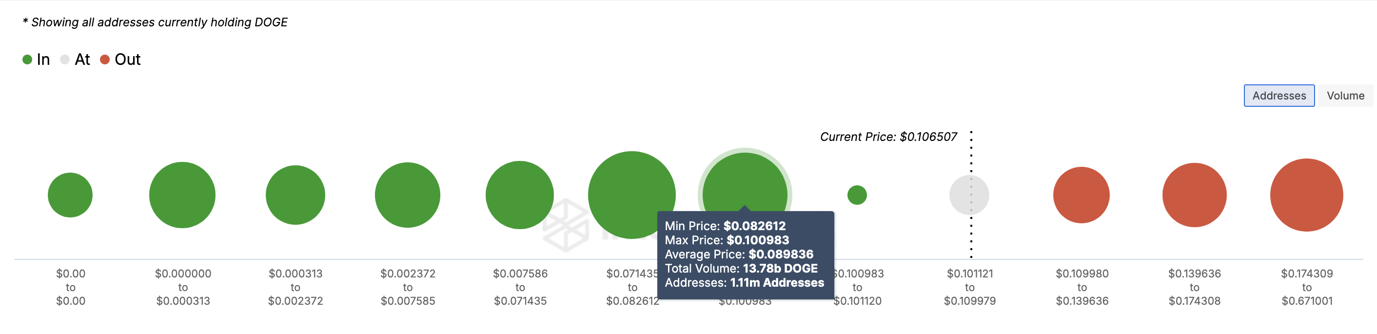 Tại thời điểm viết bài, 1.11 triệu địa chỉ đã mua 13.78 tỷ DOGE với giá từ 0,089 USD đến 0.10 USD và đang có lãi. Trong khi đó, 360,970 địa chỉ, nắm giữ hơn 48 tỷ DOGE với giá trung bình là 0.12 USD, đang lỗ.