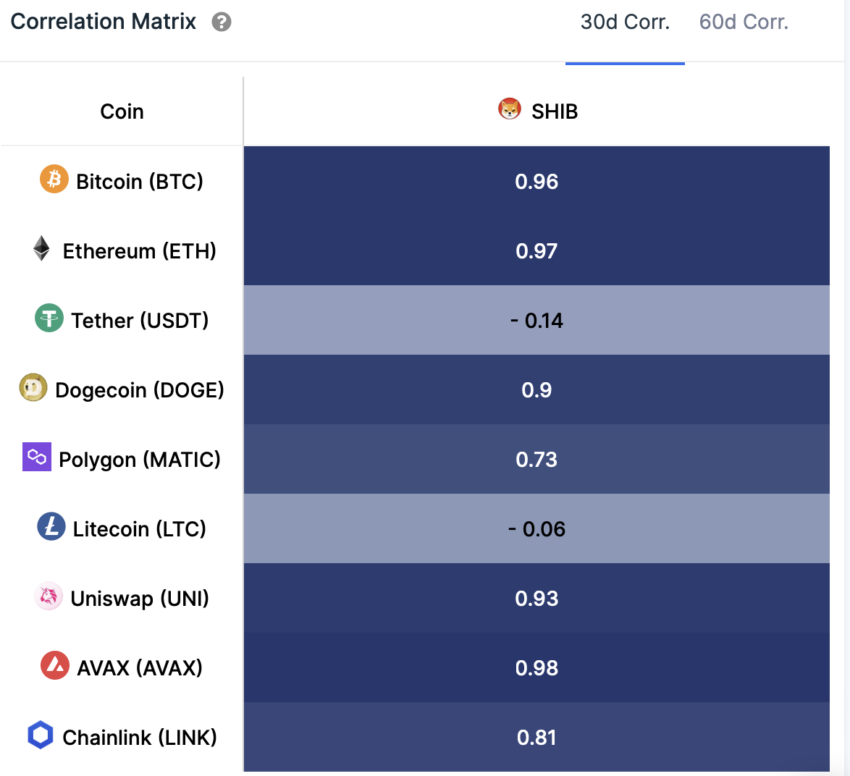 Bitcoin (BTC) và Ethereum (ETH) đang di chuyển theo quỹ đạo phạm vi mà không có chất xúc tác ngắn hạn nào cho việc tăng giá. Đáng chú ý, SHIB có mối tương quan cao với BTC và ETH vào thời điểm hiện tại. Mối tương quan giữa Shiba Inu với BTC và ETH lần lượt đạt mức 0.96 và 0.97.