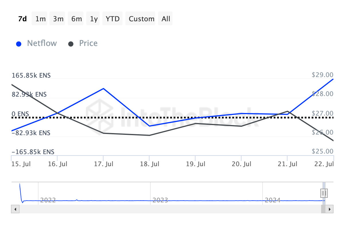 Điều này được thể hiện rõ qua việc mua vào 165,850 token vào ngày 22/07. Nếu duy trì, điều này có thể thúc đẩy đà tích cực cho giá ENS.