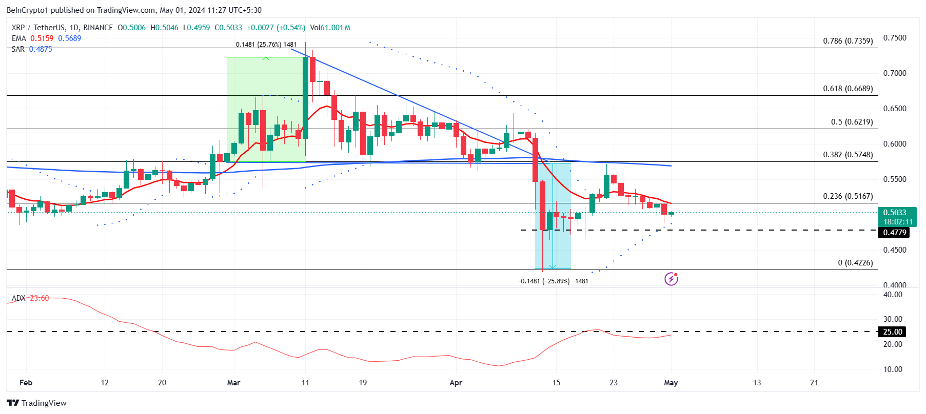 Trong tuần qua, giá XRP đã giảm từ 0.54 USD xuống còn 0.50 USD. Sự sụt giảm này đã khiến Altcoin này mất mức hỗ trợ ở mức 0.51 USD, phù hợp với mức Fibonacci Retracement 23.6% kéo dài từ mức cao 0.82 USD xuống mức thấp 0.42 USD. Kết quả là, XRP hiện đã giảm xuống dưới mốc 0.50 USD sau khi Bitcoin đột ngột giảm mạnh xuống vùng 57,000 USD.