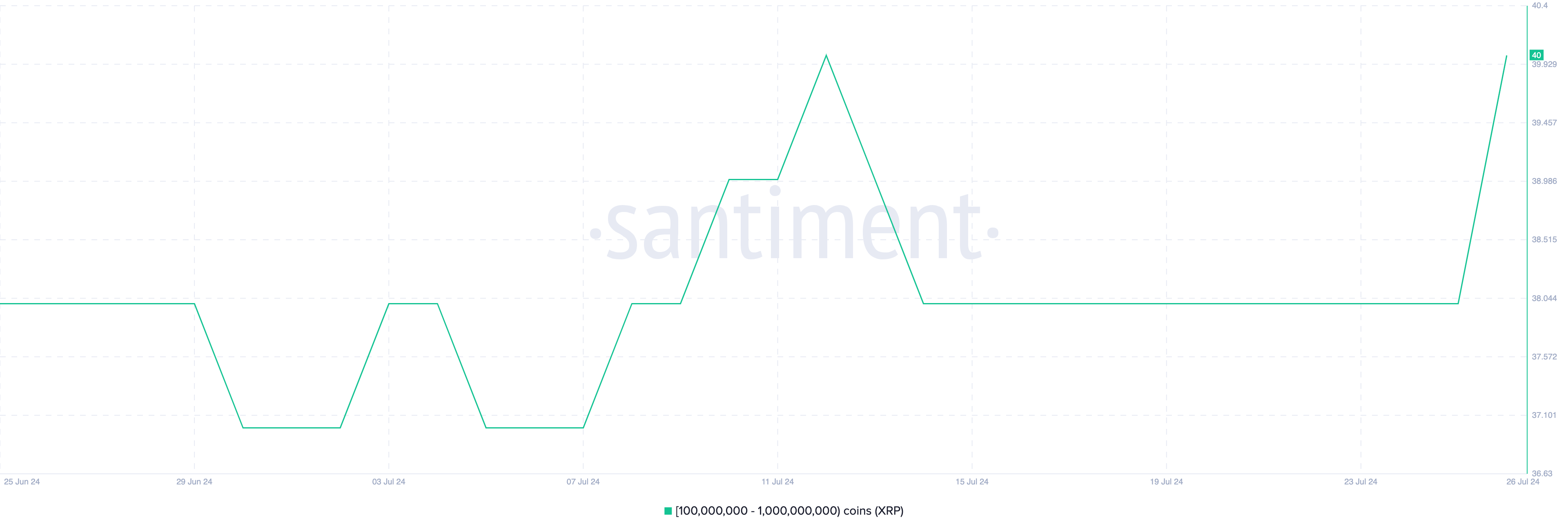 Tiếp theo trong danh sách các Altcoin được cá voi mua nhiều trong tuần thứ 4 của tháng 7 là XRP. Đồng coin này gần đây nhận được sự ủng hộ tốt trên thị trường. Theo Santiment, số lượng địa chỉ nắm giữ từ 100 triệu đến 1 tỷ token đã tăng kể từ ngày 23/07.