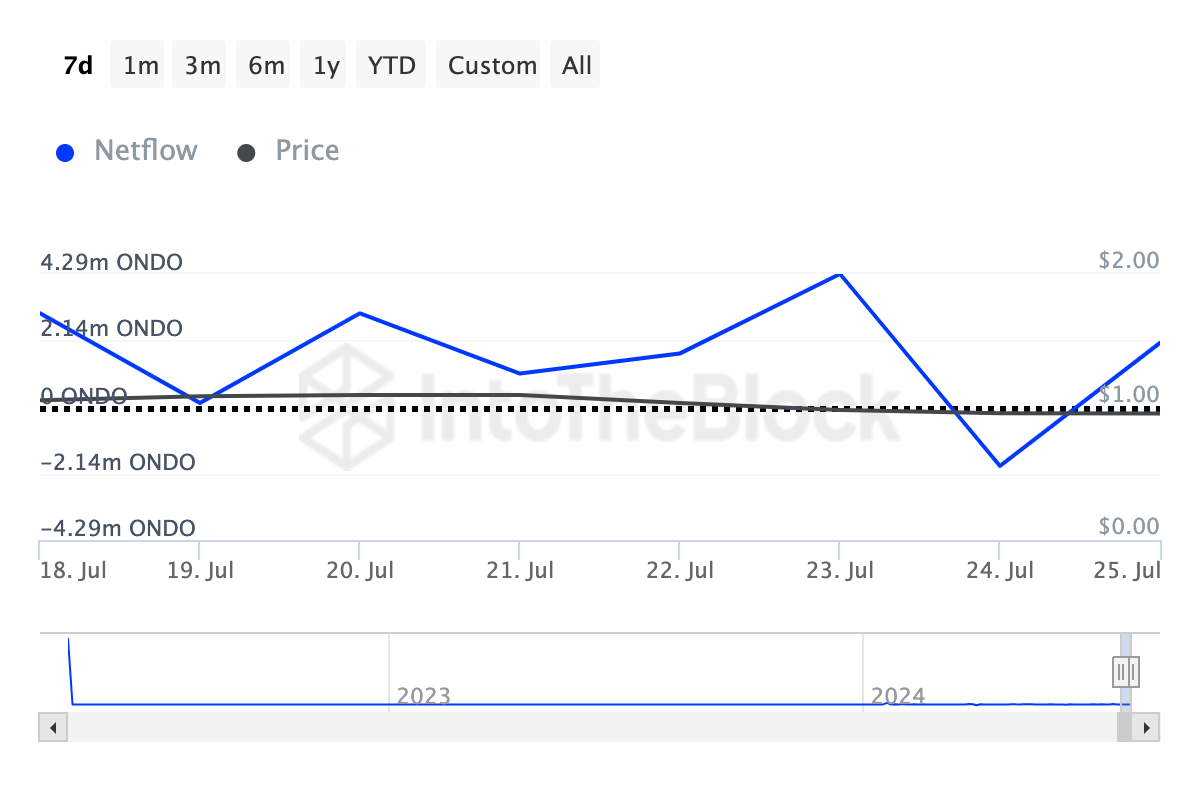 Tuy nhiên, dữ liệu từ IntoTheBlock cho thấy sự quan tâm từ các thực thể lớn và cá nhân có túi tiền rộng có thể sẽ không dừng lại trong thời gian sớm. Theo nhà cung cấp dữ liệu phân tích blockchain, lượng Netflow của các chủ sở hữu lớn của ONDO đã tăng vọt 1468.89% trong bảy ngày qua.