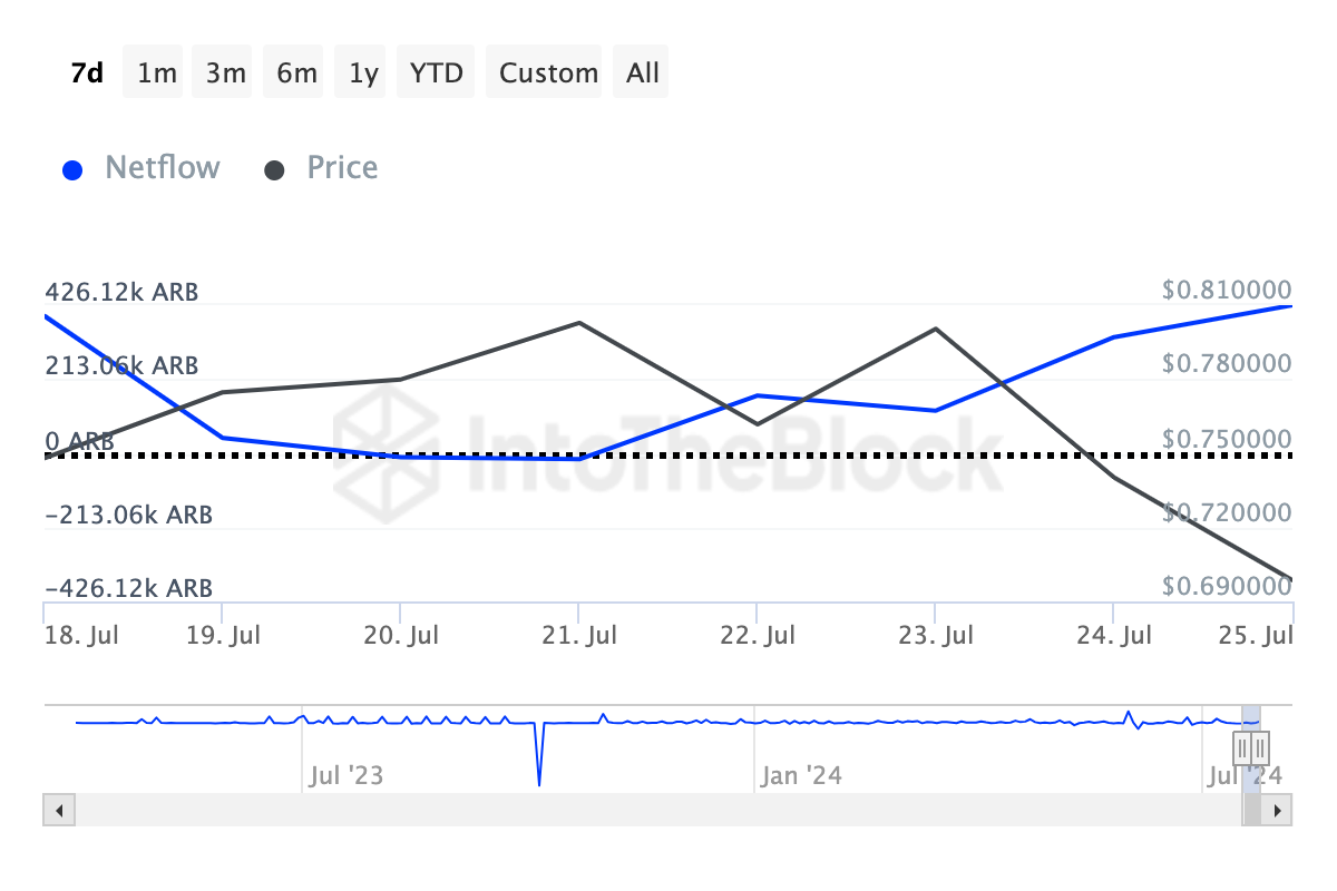 Tại thời điểm viết bài, ARB được giao dịch ở mức 0.73 USD. Mặc dù đây là một sự tăng nhẹ trong 24 giờ qua, nhưng nó không thể so sánh được với mức giảm 57.82% theo năm đến nay. Bất chấp tình trạng giá của token, nhà đầu tư lớn đã mua Altcoin này một cách tin tưởng ở một mức chưa từng thấy trong một thời gian dài. Theo IntoTheBlock, dòng tiền ròng của các chủ sở hữu lớn đã tăng vọt 870.62% trong bảy ngày qua.