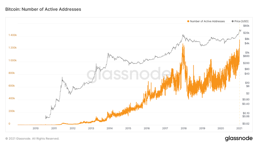 Giá Bitcoin và số lượng ví đang hoạt động có tương quan trực tiếp. Điều này đã được thể hiện qua các hồ sơ ghi nhận trước đây. Từ đó, ta có thể thấy rằng giá của loại tiền điện tử này sẽ tiếp tục phá vỡ những mục tiêu cao hơn.