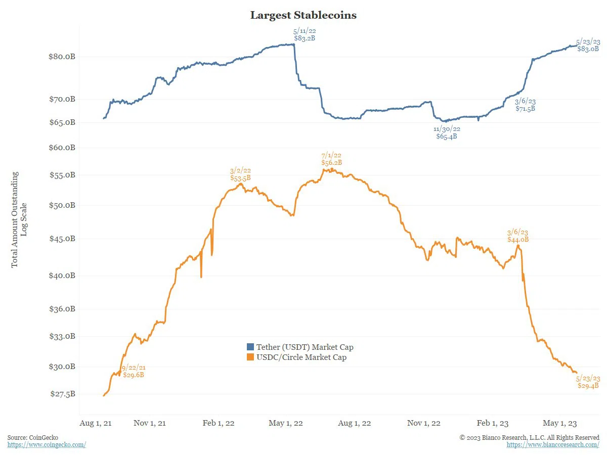 Vốn hóa thị trường của Tether USDT và Circle USDC cũng đang khá cách biệt nhau. Vốn hóa thị trường của Tether đang tăng lên trong khi Circle đang thu hẹp lại. Vào ngày 23 tháng 5, nhà nghiên cứu Jim Bianco đã quan sát thấy điều này, nhận xét rằng “họ đang đi ngược lại với sự khôn ngoan thông thường.”