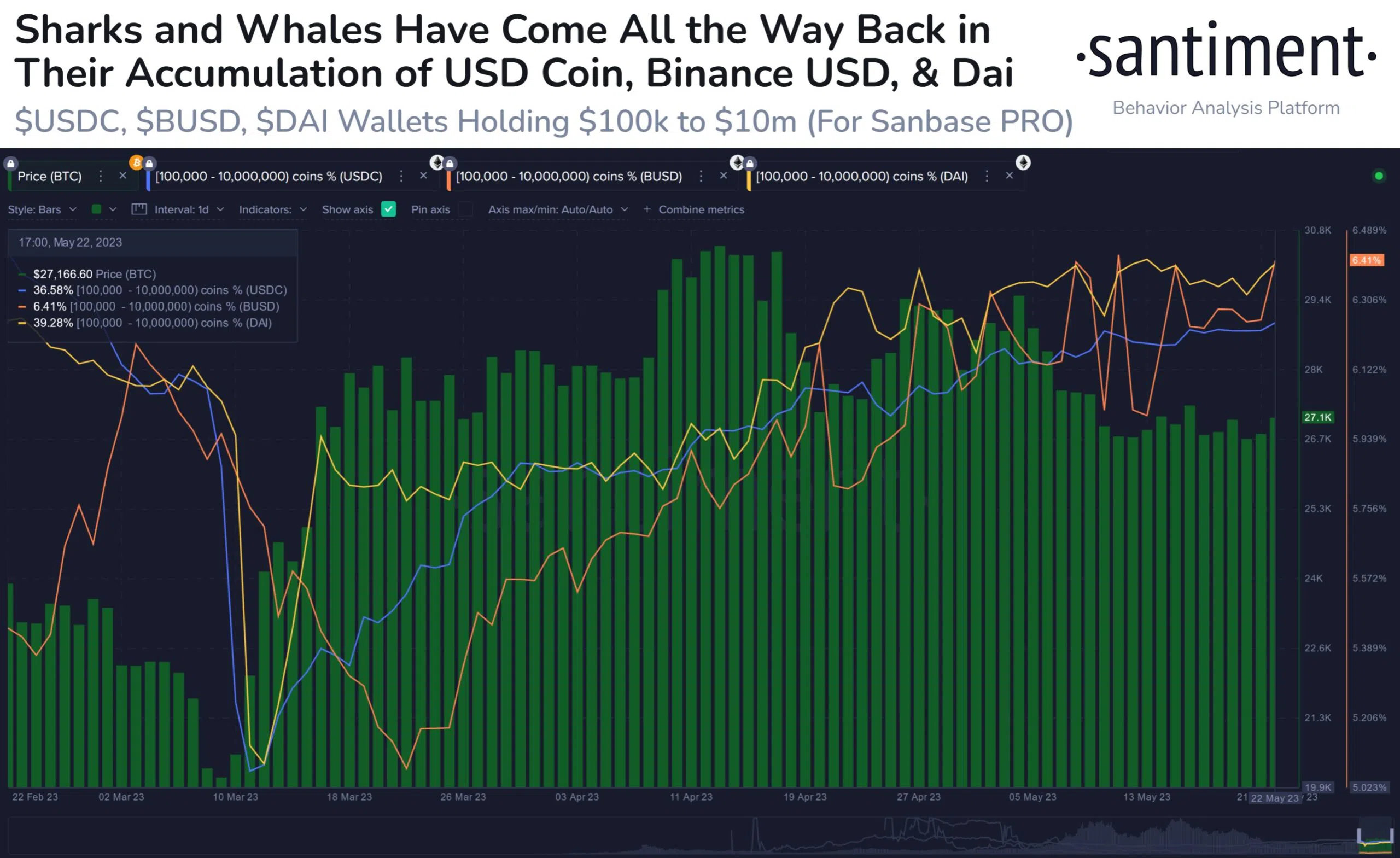 Đã có một sự gia tăng stablecoin trong ví của nhóm cá voi kể từ giữa tháng Tư. Điều này trùng hợp khi Bitcoin đạt mức cao nhất năm 2023 là 31,000 USD. Kể từ đó, BTC đã giảm 13.7%.