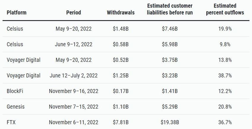 Tài liệu nghiên cứu đã trích dẫn từ hồ sơ phá sản để mô tả dòng tiền của khách hàng rút ra từ năm nền tảng, trong đó có: BlockFi; Celsius; FTX; Genesis và Voyager Digital. Nhìn chung, người dùng đã rút gần 13 tỷ USD từ các nền tảng này trong thời gian ngân hàng tương ứng của họ hoạt động.
