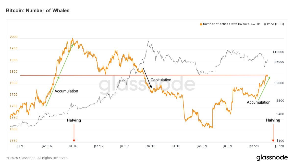 “Số lượng các cá voi BTC tiếp tục tăng, chạm mức cao 2 năm. Lần gần đây nhất mà chúng ta chứng kiến số lượng nhiều cá voi tích lũy như vậy là vào năm 2016. Đây là một điều thú vị khi so sánh với Bitcoin halving vừa qua.” – Glassnode
