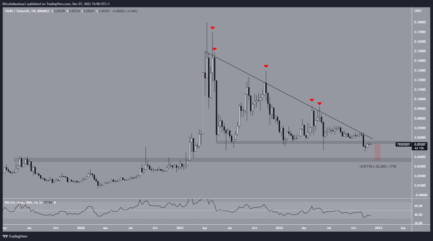 Phân tích kỹ thuật khung thời gian hàng tuần cho TRX đưa ra triển vọng giảm giá. Giá TRX đã giảm xuống dưới đường kháng cự giảm dần kể từ khi đạt mức cao nhất vào tháng 4/2021.