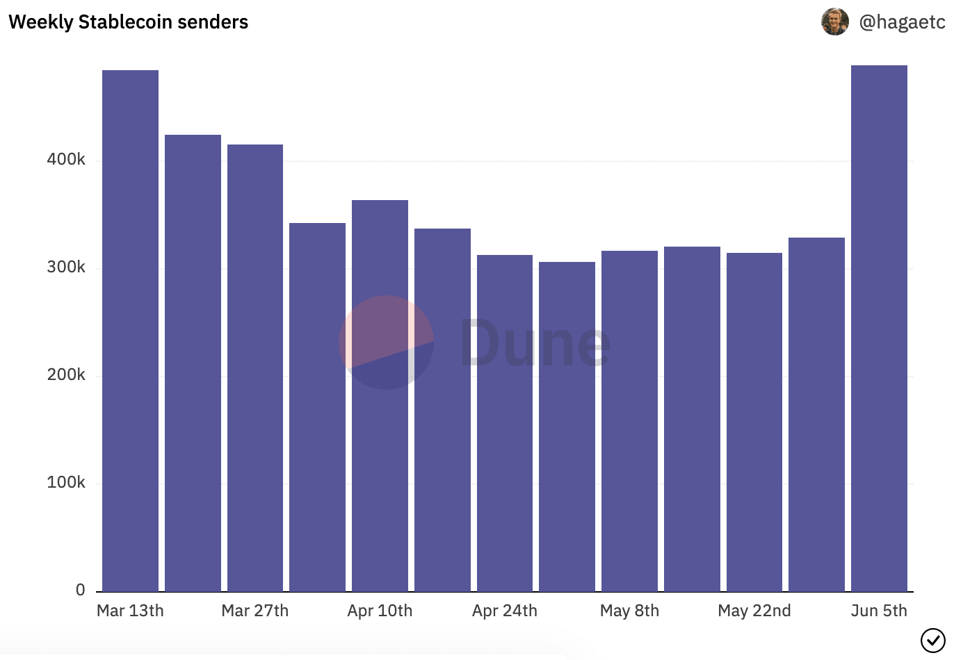 Điều này đã dẫn đến sự gia tăng đáng kể về số lượng người gửi stablecoin hàng tuần. Trên thực tế, dữ liệu từ Dune Analytics tiết lộ rằng số lượng người gửi hàng tuần trên mạng đạt 489,384 tại thời điểm BeInCrypto viết bài này.
