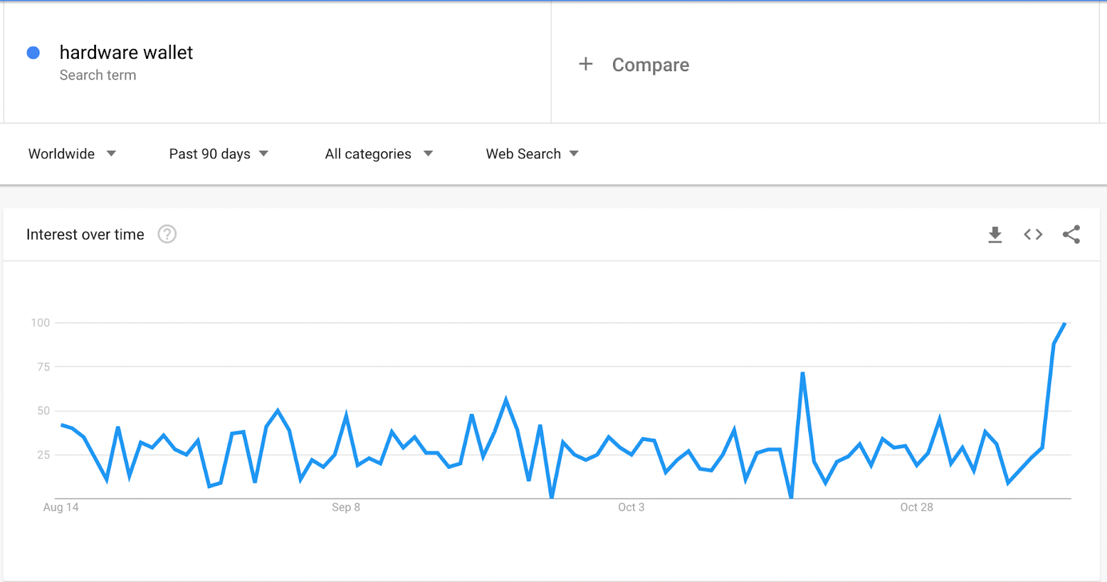 Theo đó, mọi người đang rút tiền điện tử của họ từ các sàn giao dịch tập trung về các ví tự lưu trữ như MetaMask hay Trust Wallet hoặc trên ví cứng của họ. Lượng tìm kiếm trên Google cho cụm từ hardware wallet đang ở mức cao nhất trong 90 ngày qua.