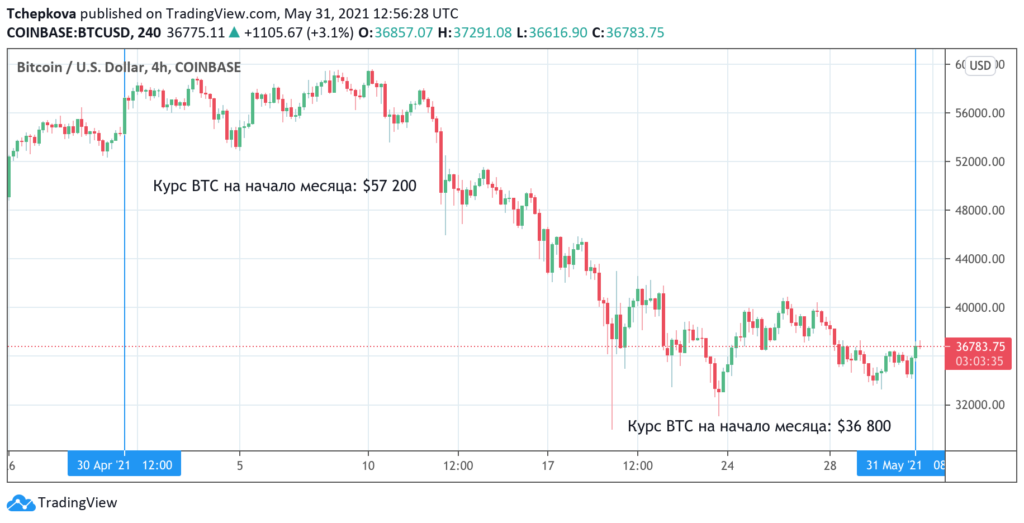 Vào giữa tháng, giá Bitcoin giảm mạnh xuống còn 28.157 USD (theo giá BitMEX). Tổng kết tháng 5, Bitcoin là đồng tiền điện tử có kết quả tệ thứ 2 trong top 3 đồng tiền điện tử có vốn hoá lớn nhất thị trường. Ngày cuối cùng của tháng 5, Bitcoin đã bay mất 36,39% giá trị so với đầu tháng. Trong khi đó, Ethereum (ETH) giảm 13,5%. Đồng Binance (BNB) giảm nhiều nhất mất 45,08% giá trị.