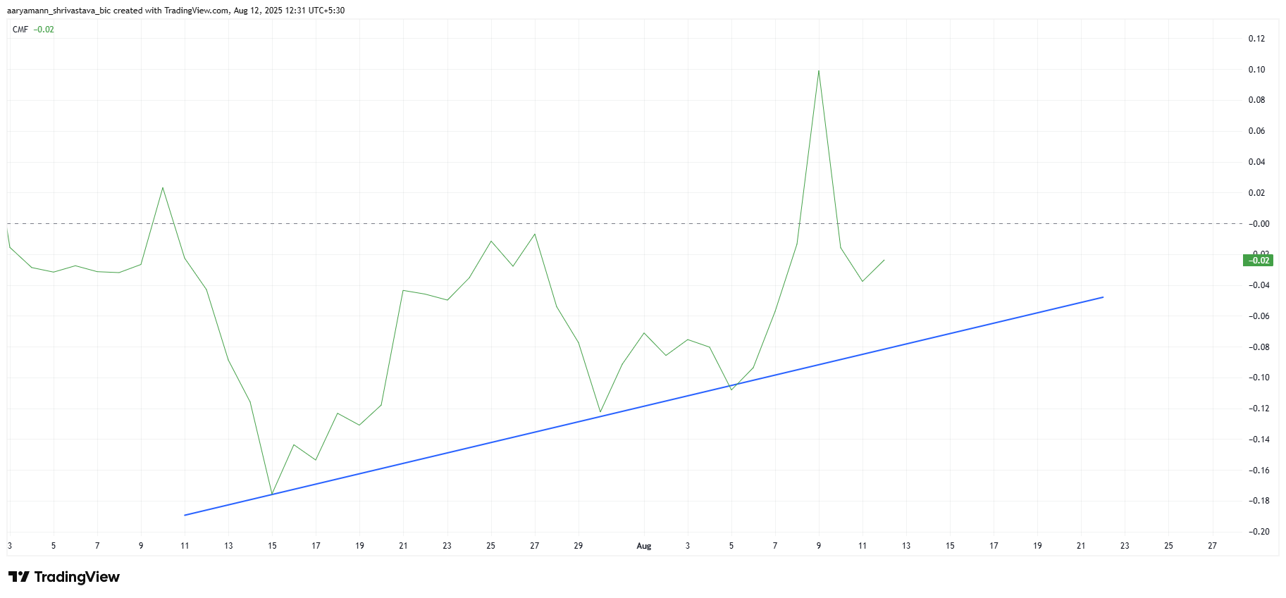 Mặc dù tâm lý thị trường chung là giảm, nhưng Chaikin Money Flow (CMF) của Pi Coin đã cho thấy xu hướng tăng. CMF chỉ ra dòng tiền vào Pi Coin đang tăng, cho thấy sự quan tâm của nhà đầu tư đang tăng lên, mặc dù có sự dao động trong cam kết.