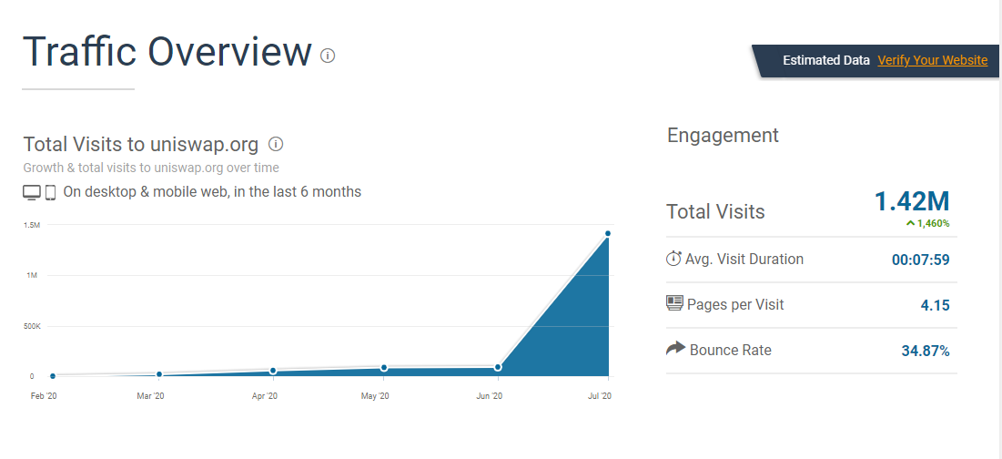 Theo SimilarWeb, khối lượng giao dịch của Uniswap tăng đột biến đến 1,5 triệu trong tháng vừa qua. Cho thấy sự quan tâm của cộng động đối với DEX.