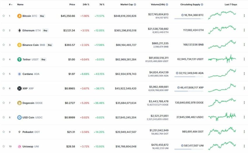Theo CoinMarketCap, giá trị cao nhất của bitcoin trong 24 giờ được cố định ở mức 46,228 USD. Còn mức tối thiểu của nó là 43,861 USD.