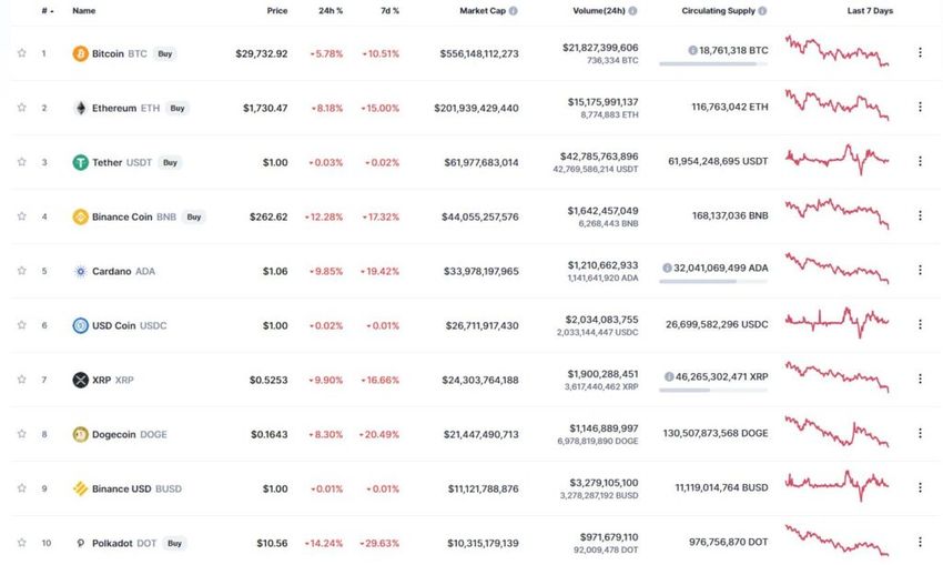 Trong top 10 tiền điện tử có vốn hóa thị trường xếp hàng đầu, tất cả chúng đều cho thấy những tín hiệu tiêu cực. Mức lỗ lớn nhất trong 24 giờ qua (-14.24%) và trong cả một tuần (-29.63%) được ghi nhận thuộc về Polkadot.