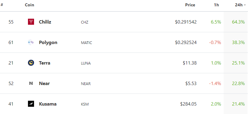 Dự án này đã thống trị danh sách top 100 trong nhiều ngày qua. CHZ chiếm vị trí tăng giá hàng đầu trong ít nhất ba ngày gần đây trong khi lọt vào top 5 tận hai lần.