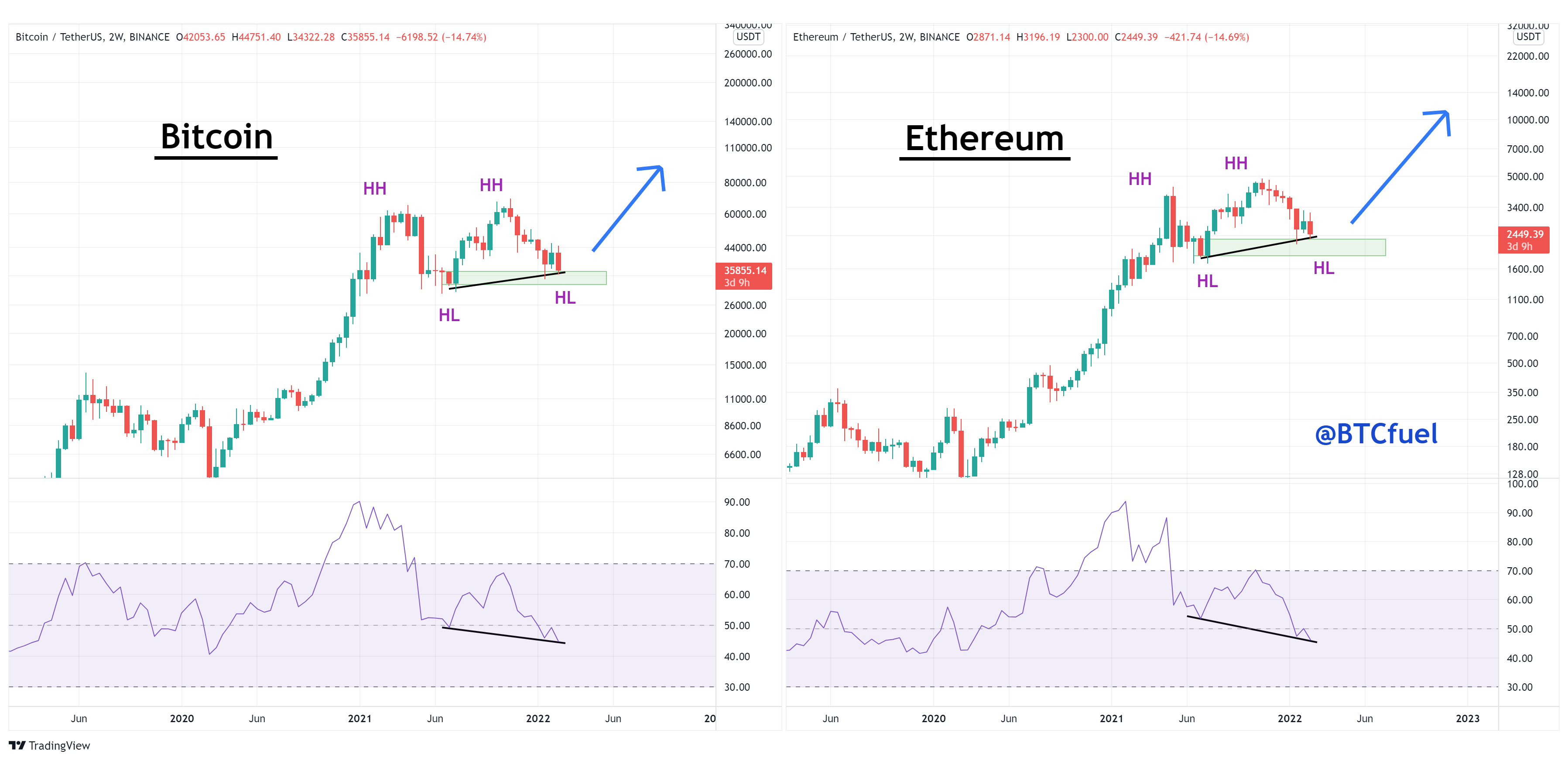 Quan sát và phân tích của @BTCfuel chỉ ra sự bảo toàn của cấu trúc tăng giá trên cả Bitcoin và Ethereum.