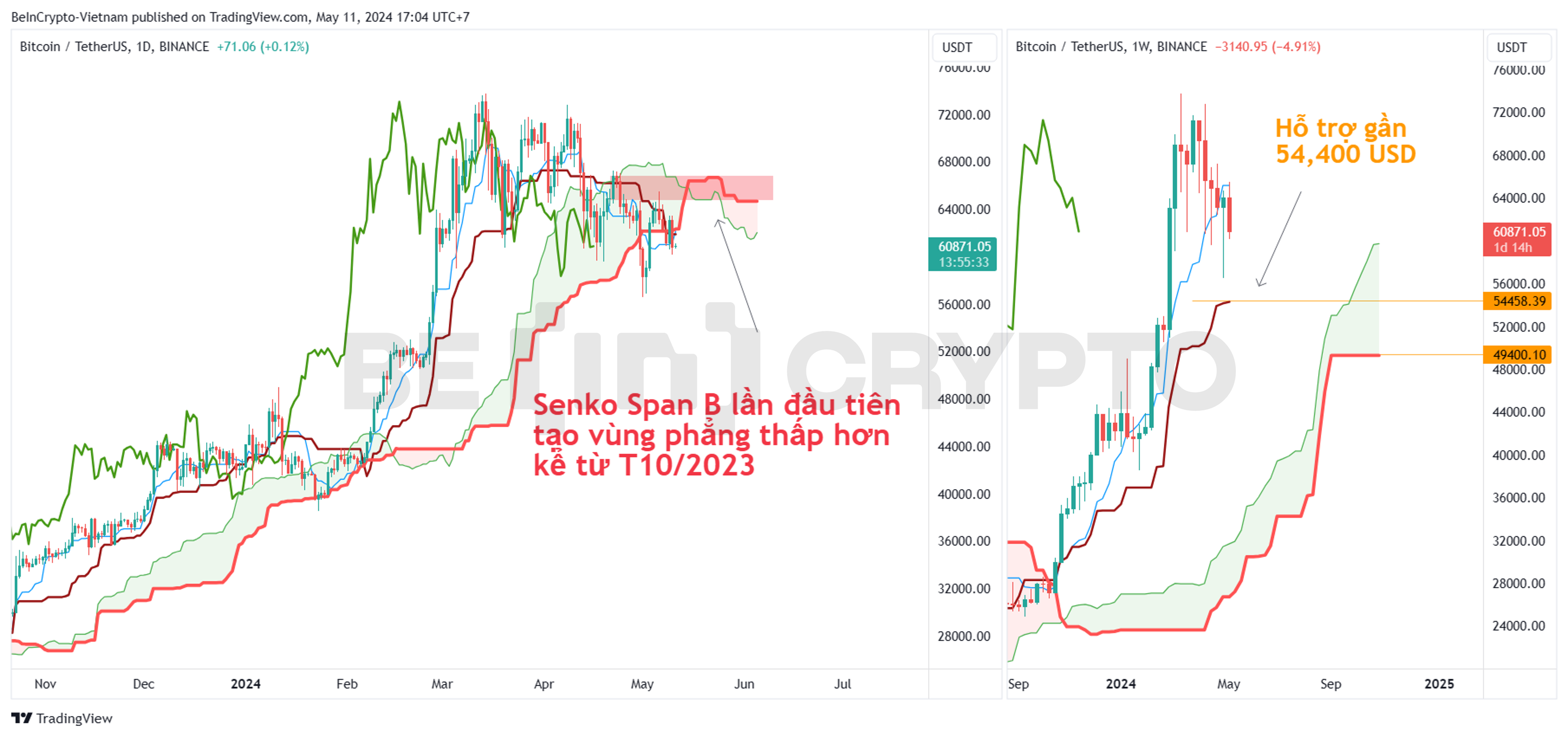 Ichimoku khung ngày chỉ ra kháng cự của tháng 5 ở tại vùng 64,000 USD – 66,000 USD. Quan sát bổ sung Ichimoku khung tuần, hỗ trợ gần của BTC tại 54,400 USD tương đương với đường Kijun Sen. Hỗ trợ mạnh tại 49,400 USD tương đương Senko Span B khung tuần.