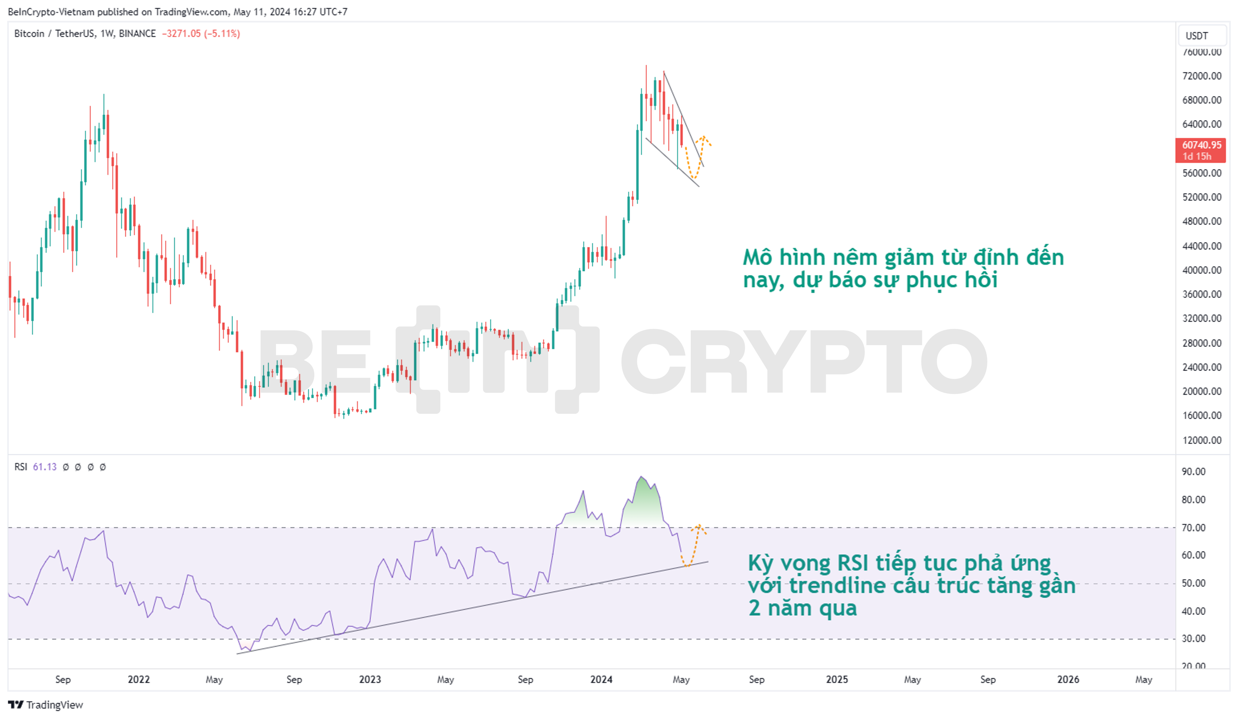 - Kết hợp quan sát với RSI khung 1W, trendline cấu trúc tăng từ giữa năm 2022 đến nay vẫn còn giữ vững. Hiện RSI khung tuần có khuynh hướng tiếp cận trendline này. Nếu BTC giảm sâu hơn theo mô hình nêm giảm, có thể tương đương RSI giảm về trendline.