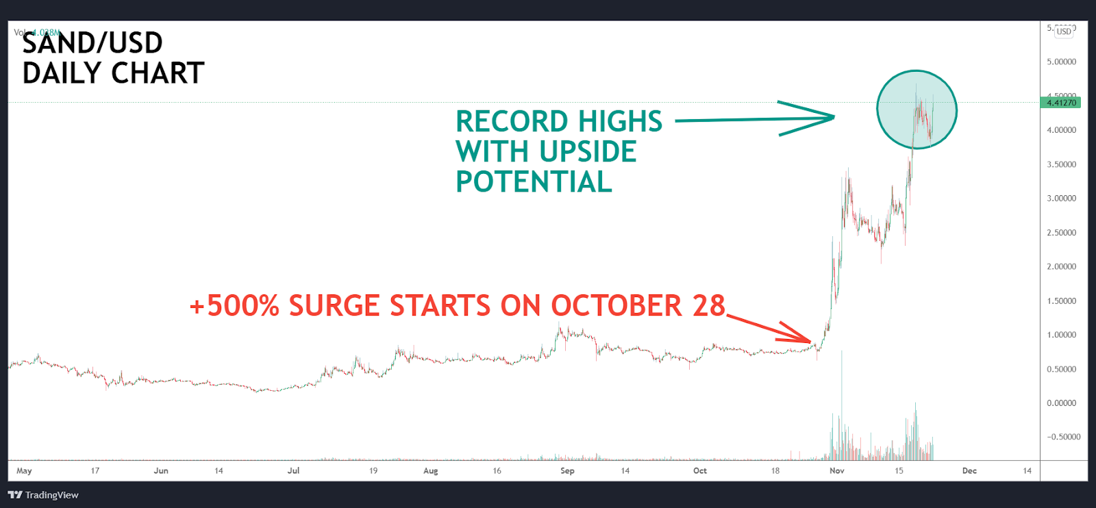 Những sự kiện này xảy ra nối tiếp nhau đã trở thành động lực giúp giá SAND tăng theo quỹ đạo parabol và tăng hơn 500% trong vòng chưa đầy một tháng. Giá SAND có điều chỉnh một chút trên đường đi nhưng cơn sốt vẫn chưa dừng lại và SAND vẫn đang trên đường thiết lập những mức đỉnh mới. Sắp tới vào ngày 29 tháng 11, The Sandbox sẽ chính thức ra mắt Metaverse và chúng tôi nghĩ giá SAND vẫn tiếp tục gia tăng phản ánh sự mong đợi và kỳ vọng của người dùng.