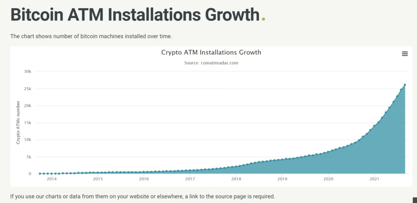 Tính đến ngày 31/08, theo coinatmradar, số lượng máy ATM tiền điện tử trên toàn cầu đạt mức 26,054. So với con số 13,997 máy ATM kể từ tháng 1/2021, số lượng máy lắp đặt thêm đã tăng đến 86%. Đồng thời, số lượng máy ATM lắp đặt trong năm 2021 cũng cao hơn 58% so với toàn năm 2020.