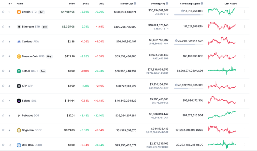 Trong top 10 tiền điện tử có vốn hóa thị trường nhiều nhất, Bitcoin (BTC) có giá trị tăng trưởng tốt nhất trong ngày qua khi tăng 3.8%. Còn trong tuần qua, mã thông báo Polkadot (DOT) vẫn là tiền điện tử dẫn đầu tăng trưởng. Giá trị của DOT đã tăng 32% trong 7 ngày.