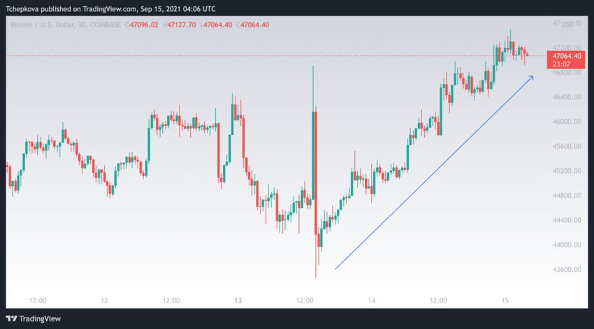 Giá của Bitcoin (BTC) đang tiếp tục phục hồi. Vào sáng ngày 15 tháng 9, tiền điện tử chính đã chạm được mức đỉnh cục bộ tại 47,489 USD. Trong tuần qua, tỷ giá BTC / USD đã tăng gần 4%, còn trong ngày là tăng 1.5%. Tại thời điểm viết bài, BTC / USD đang giao dịch ở mức 47,000 USD.
