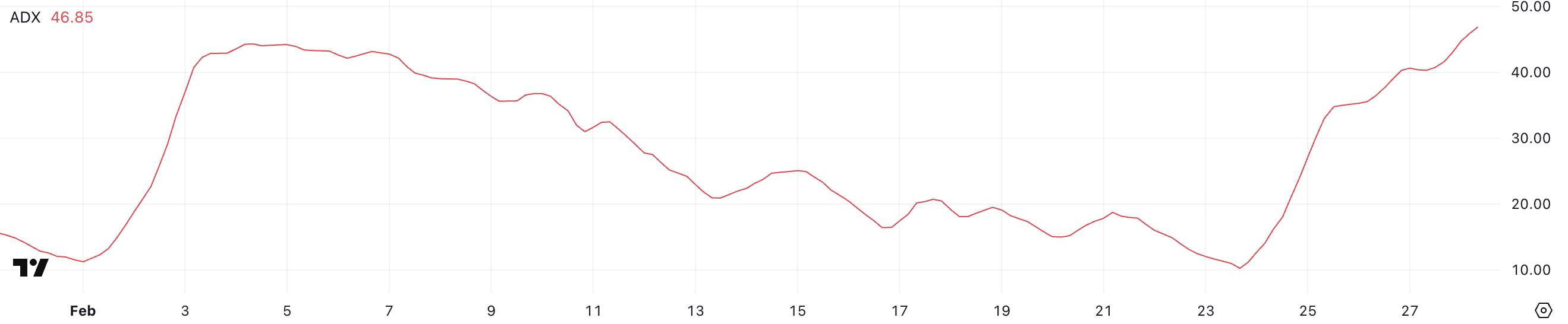 ADX của ADA hiện tại là 46.8, tăng mạnh từ 10.3 vào ngày 23/02. Average Directional Index (ADX) đo lường sức mạnh của một xu hướng mà không chỉ ra hướng đi của nó.