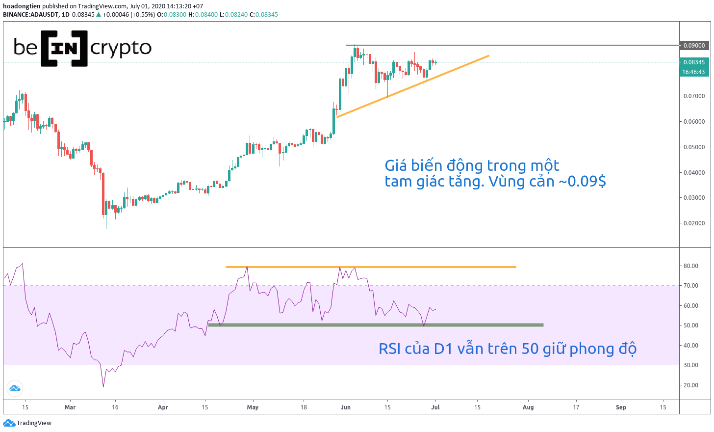 - Xem kỹ hơn khung D1 với chỉ báo RSI, dường như những tín hiệu suy giảm gần đây của Bitcoin không ảnh hưởng gì mấy tới lực mua của ADA. RSI của D1 vẫn giữ trên mức 50, đảm bảo lực mua vẫn đang chiếm ưu thế. Giá lại biến động trong một tam giác tăng, ham he phá vỡ mức 0.09$.