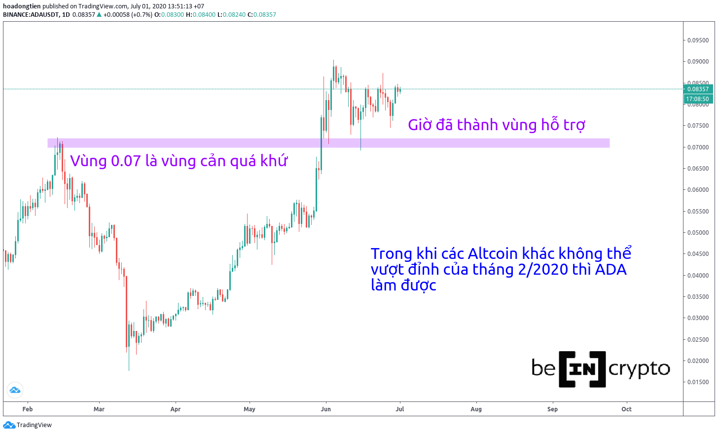 Nhìn nhanh qua biểu đồ giá ADA khung D1, dễ dàng nhận thấy ADA đã phá cản của tháng 2/2020. Điều mà rất ít Altcoin làm được trong thời gian qua.