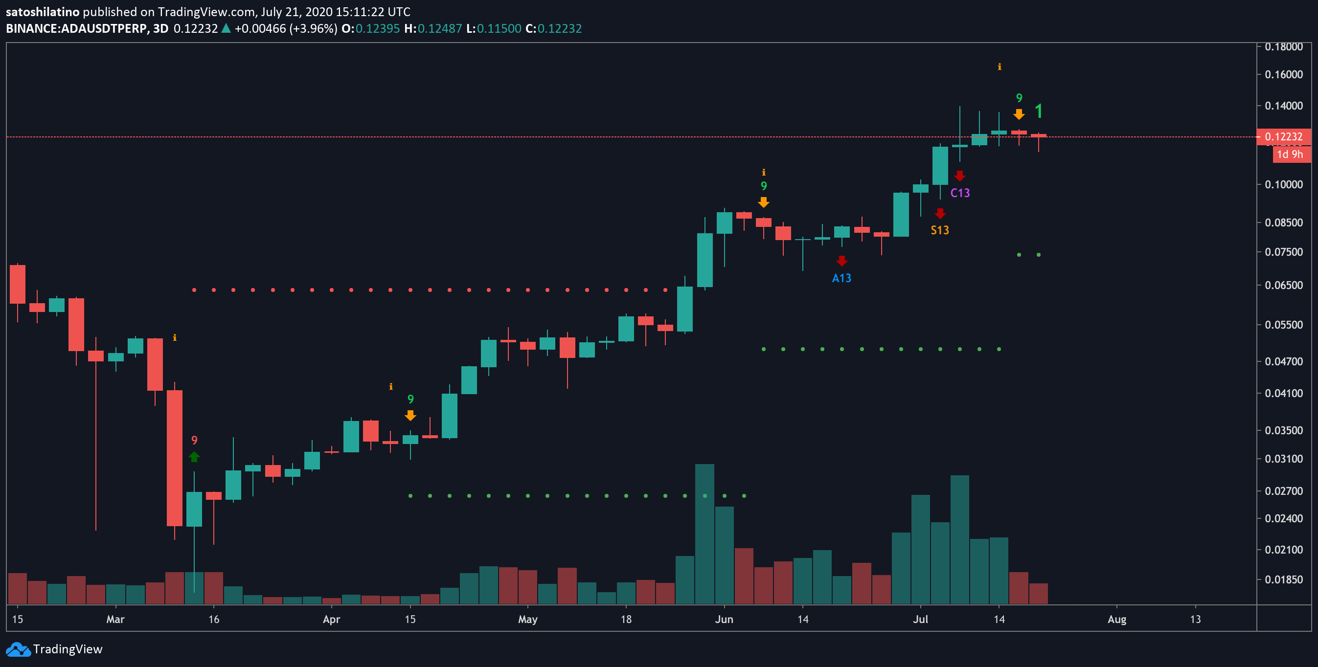 “Chỉ báo TD sequential xuất hiện dấu hiện bán trong 3 ngày của ADA. Mô hình giá giảm đã phát triển như một nến 9 xanh. Điều đó cho thấy, Cardano chuẩn bị cho một điều chỉnh từ 1 đến 4 nến.”