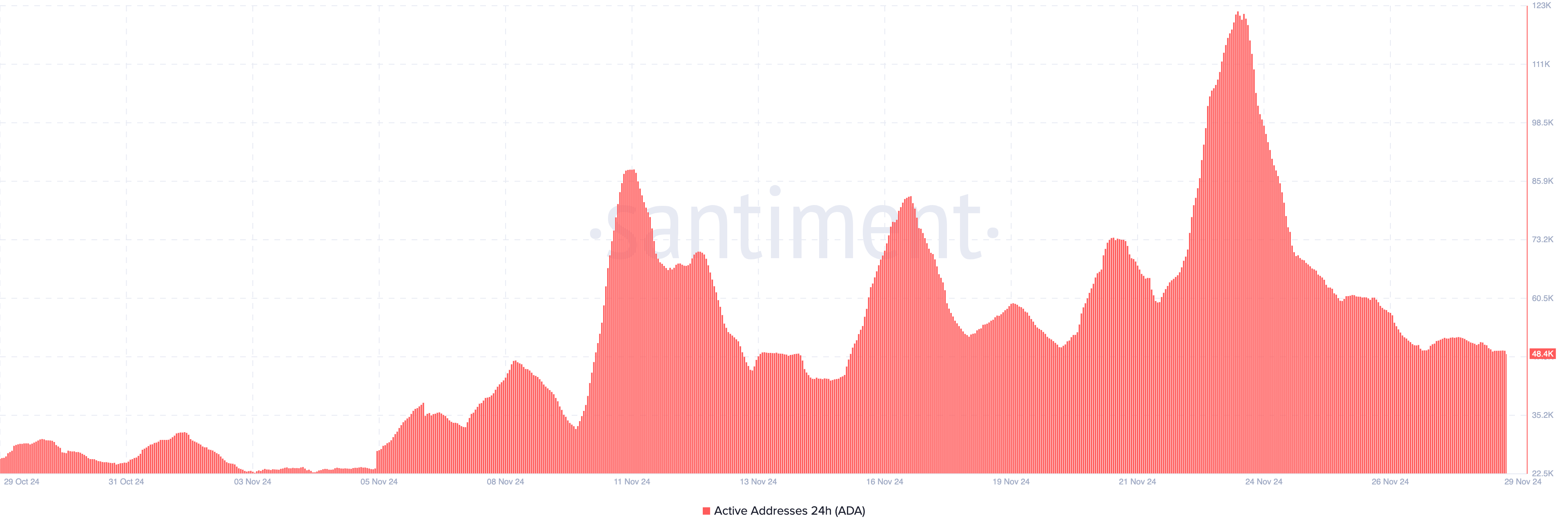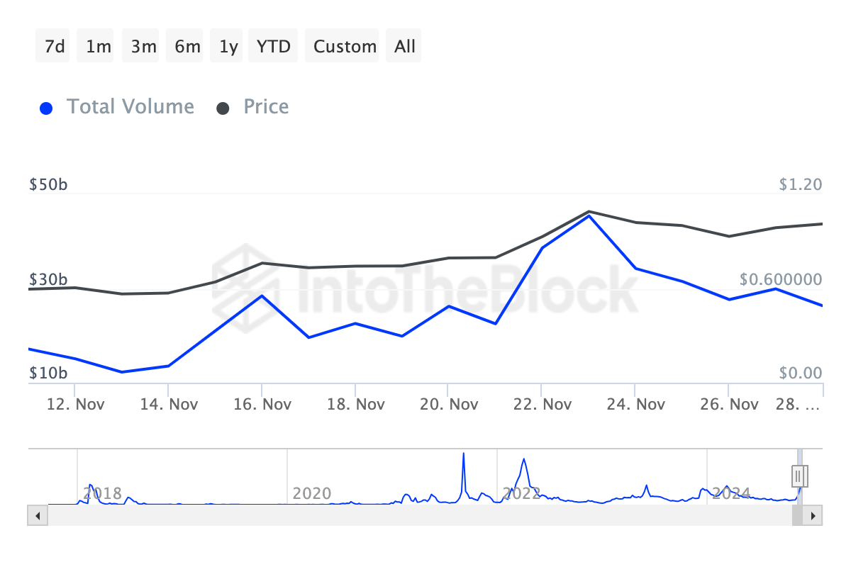 Theo lịch sử, giá của ADA thường tăng cùng với sự gia tăng của các giao dịch lớn. Ví dụ, hình ảnh dưới đây cho thấy sự gia tăng của chỉ số này từ ngày 16 đến 23/11. Trong giai đoạn đó, giá trị của Altcoin đã tăng từ 0.57 USD lên 1.09 USD, cho thấy rằng các cá voi đã đóng vai trò lớn trong sự tăng giá này. Do đó, nếu sự giảm sút hiện tại tiếp tục, token có thể đối mặt với áp lực giảm giá thêm.