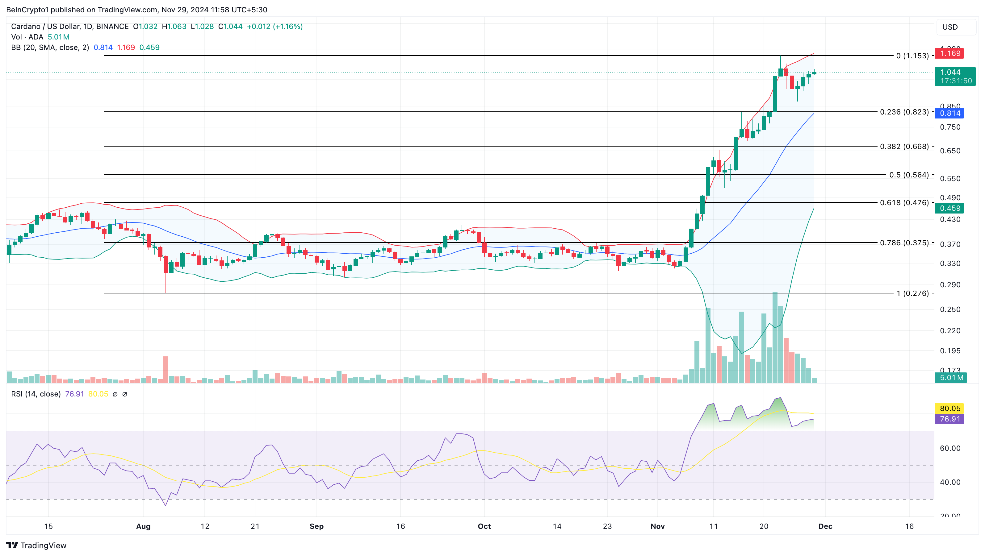 Trên biểu đồ hàng ngày, giá của ADA giao dịch quanh mức 1.04 USD. Tuy nhiên, Chỉ số RSI hiện ở 76.91. RSI đo lường động lượng bằng cách sử dụng tốc độ và kích thước của các thay đổi giá. Nó cũng cho biết khi nào một loại tiền điện tử bị mua quá mức hoặc bán quá mức. Khi chỉ số trên 70.00, nó bị mua quá mức. Ngược lại, khi dưới 30.00, nó bị bán quá mức. Xem xét tình hình hiện tại, có vẻ như giá của ADA đang bị mua quá mức, và có thể sẽ giảm.