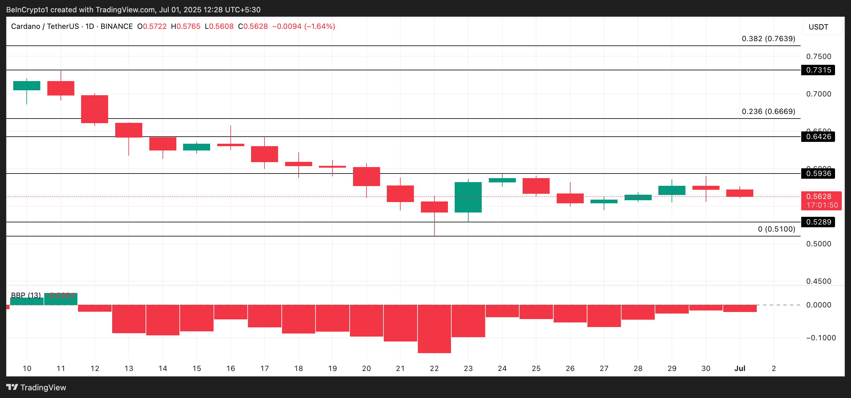 Trên biểu đồ hàng ngày, chỉ số Elder-Ray của ADA xác nhận sức mạnh giảm giá trên thị trường. Chỉ báo động lượng này đã liên tục in các thanh màu đỏ kể từ ngày 12/06, cho thấy sự thống trị mạnh mẽ của người bán. Tại thời điểm viết bài, chỉ số Elder-Ray của ADA là -0.0204.