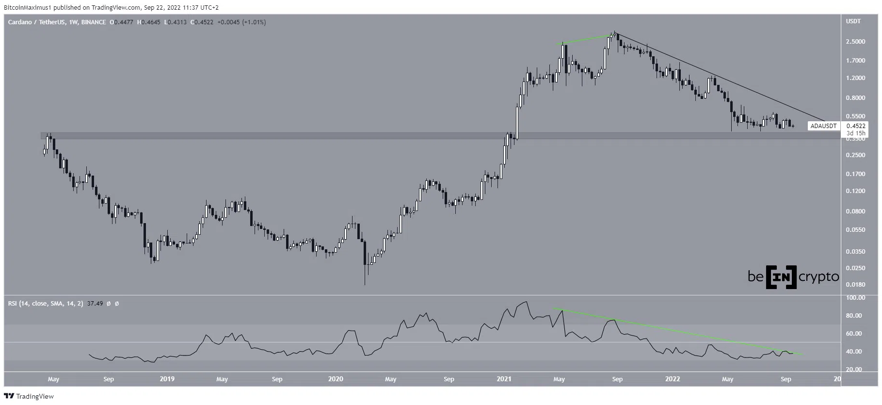 Về mặt phân tích kỹ thuật, giá ADA đã giảm xuống dưới đường kháng cự giảm dần kể từ tháng 9/2021, khi nó vừa đạt mức giá cao nhất mọi thời đại là 3.1 USD. Sự sụt giảm đã dẫn đến mức thấp nhất là 0.4 USD vào tháng 5/2022. Mức thấp được thực hiện ngay trên vùng hỗ trợ ngang 0.36 USD, đóng vai trò là đỉnh vào tháng 5/2018.