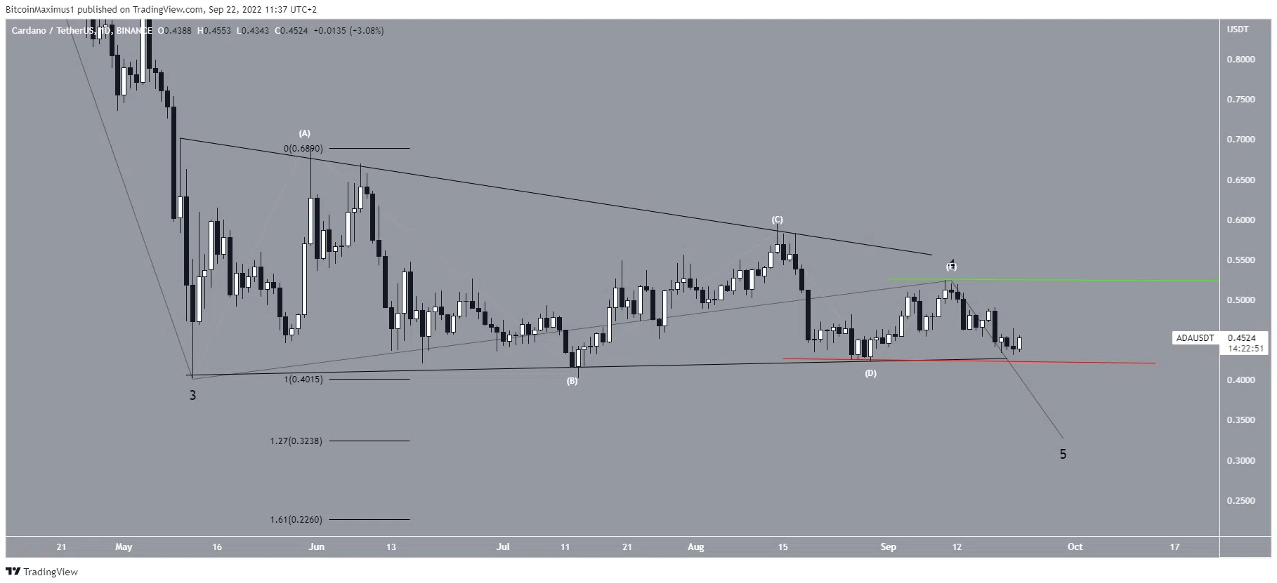 Kể từ đáy tháng 5/2022, có vẻ như ADA đang giao dịch bên trong một tam giác đối xứng. Đây có thể là sóng 4 (màu đen) của xu hướng giảm gồm năm sóng. Số lượng sóng phụ được đánh dấu bằng màu trắng.