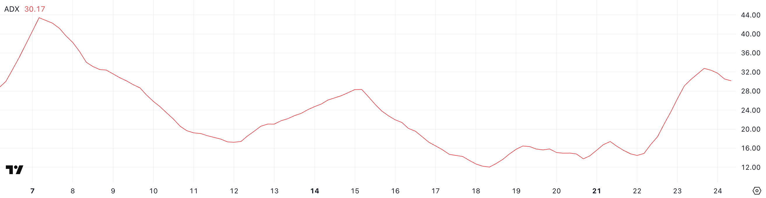 Chỉ số Average Directional Index (ADX) của Cardano hiện tại là 30.17, giảm nhẹ từ mức 32.76 của ngày hôm qua sau khi tăng mạnh từ 14.90 hai ngày trước.
