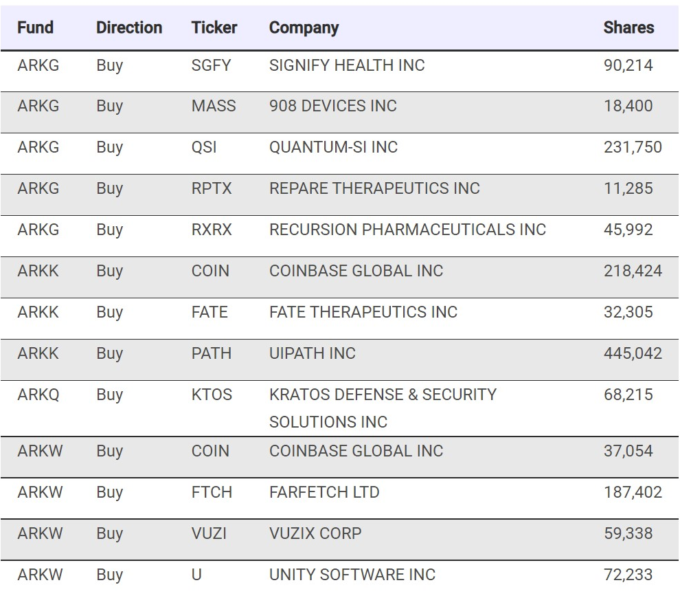 Theo nguồn tin thì Ark Invest phân loại số cổ phiếu mua từ Coinbase vào hai quỹ đầu tư riêng biệt. Nếu như danh mục ARK ETF đổi mới (NYSEARCA:ARKK) đặc biệt tập trung vào công ty công nghệ. Ark Invest đã chuyển mua 218,424 cổ phiếu của Coinbase vào danh mục này.