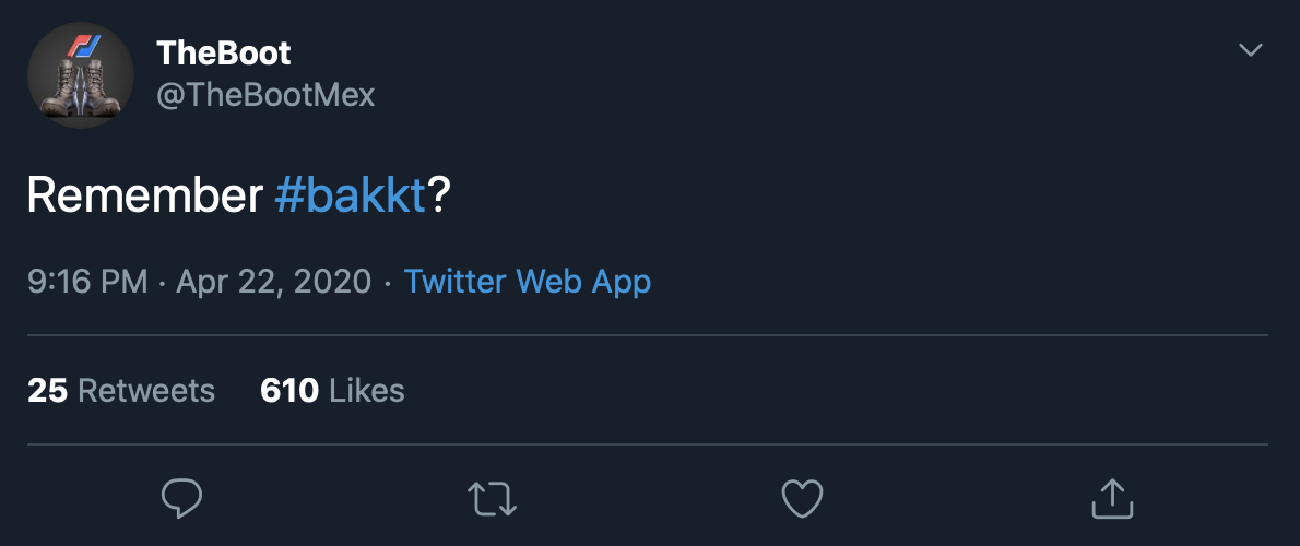 Điều gì đã xảy ra với Bakkt? Đó là câu hỏi mà nhà giao dịch TheBoot gần đây đã hỏi những người theo dõi của mình, khi họ cố cố nhớ lại sàn này đã từng được thổi phồng lên như thế nào.