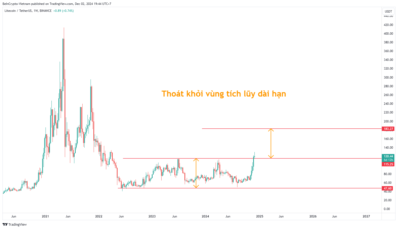 Cấu trúc đáng theo dõi đầu tiên là những Altcoin cho dấu hiệu thoát ra khỏi vùng sideway tích lũy dài hạn. Vùng tích lũy này có thể kéo dài 1 năm, 2 năm hoặc thậm chí 3 năm. Ví dụ dưới đây là Litecoin (LTC). Target của những Altcoin dạng này là mức giá có biên độ tăng tương đương với biên độ vùng tích lũy (như minh họa).