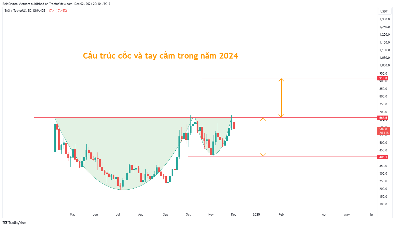 Cấu trúc đáng chú ý thứ hai đó là cấu trúc cốc và tay cầm trong năm 2024. Đa phần các Altcoin này đã trải qua quá trình điều chỉnh và phục hồi trong quý II và quý III, đến quý IV các Altcoin này có khuynh hướng trở lại đỉnh của tháng 3. Ví dụ dưới đây là Bittensor (TAO). Target của Altcoin dạng này là mức giá có biên độ tăng tương đương biên độ của “tay cầm” (như minh họa).