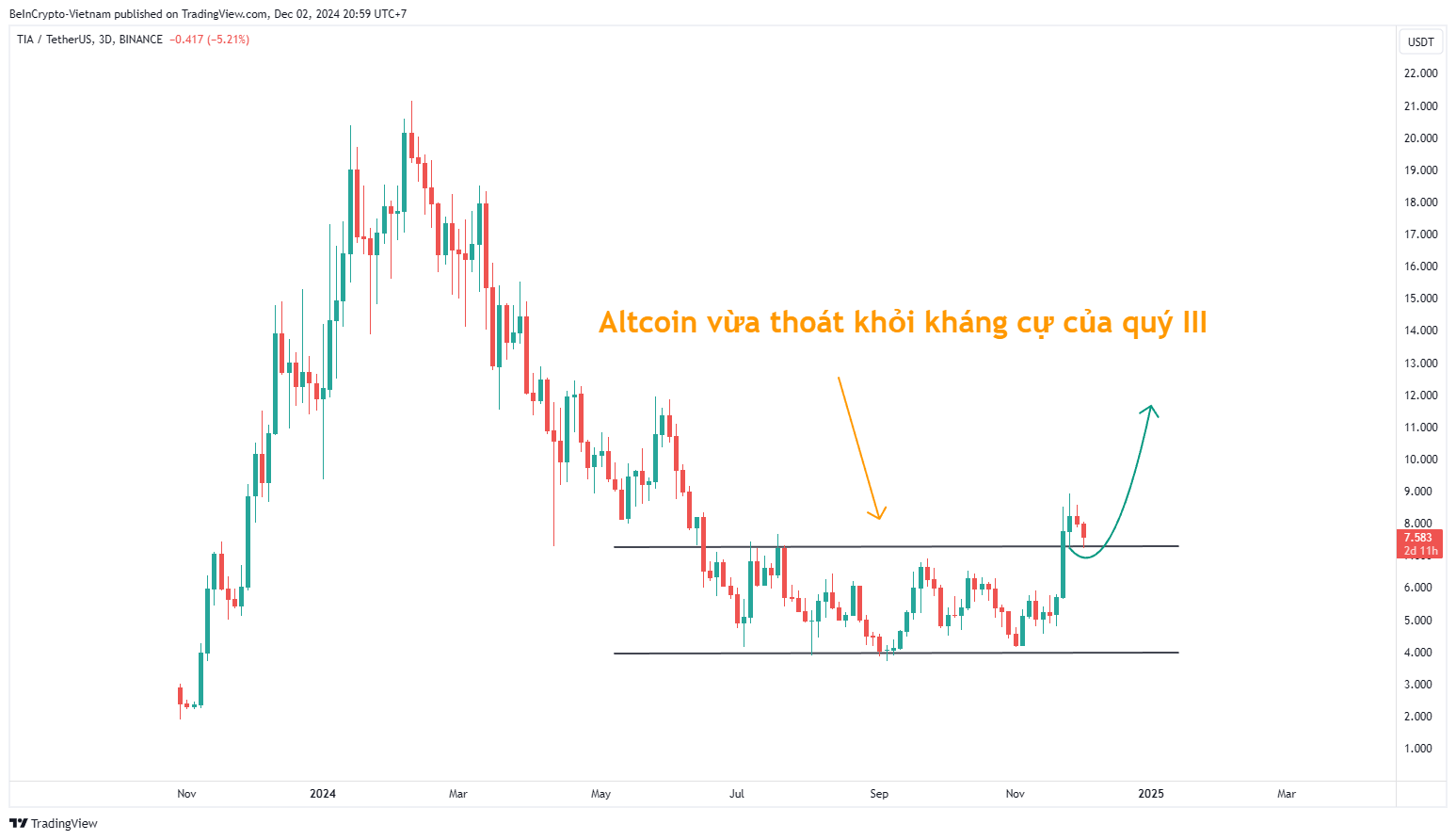 Cấu trúc thứ ba, đó là những Altcoin vừa thoát khỏi kháng cự của quý trước nhưng giá vẫn chưa tăng trở lại mức cao của năm, cũng có khả năng tiếp tục tăng. Đây là những đồng tiền đã giảm rất mạnh trong năm qua, và hình thành vùng tích lũy ngắn trong quý III. Ví dụ dưới dây là Celestia (TIA). Target của những Altcoin này là mức cao hồi đầu năm nay.