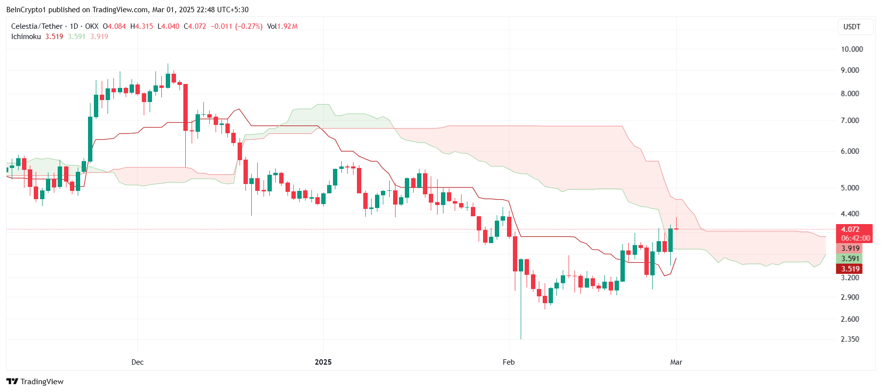 Hành động giá của Celestia cũng bị ảnh hưởng bởi các tín hiệu thị trường rộng lớn hơn, với Đám mây Ichimoku chỉ ra xu hướng giảm trong toàn bộ thị trường. Hiện tại, TIA vẫn nằm trên các cây nến, cho thấy altcoin này phần nào được bảo vệ khỏi áp lực thị trường này.