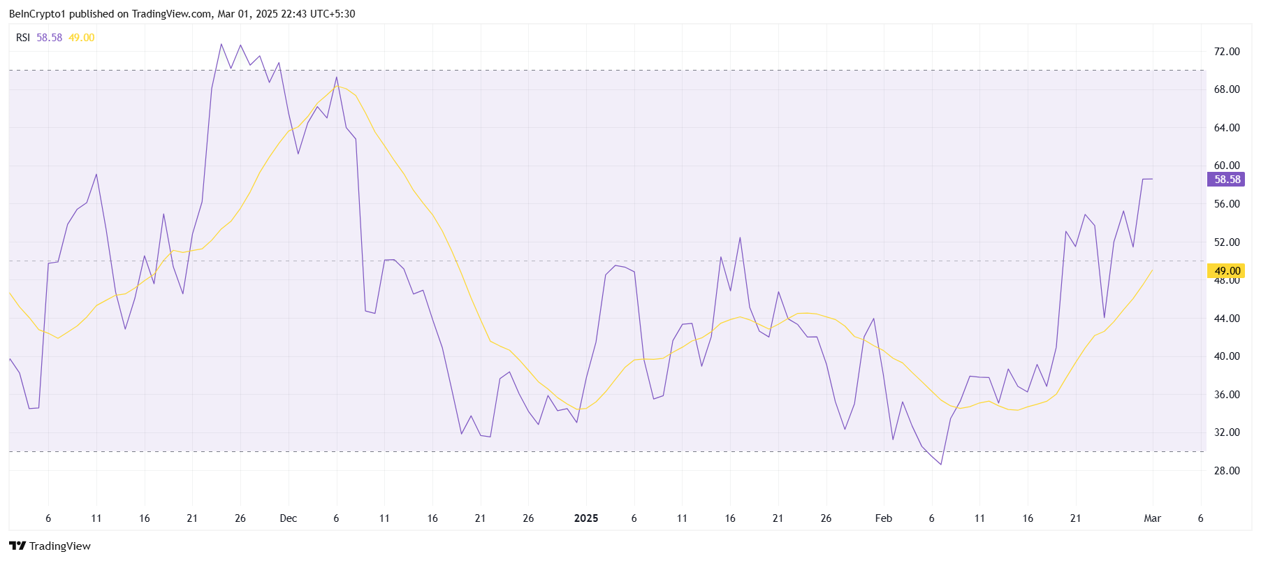 Chỉ số Sức mạnh Tương đối (RSI) của Celestia gần đây đã đạt mức cao nhất trong gần ba tháng, phản ánh sức mạnh của động lực tăng giá của altcoin này. Sự gia tăng RSI này cho thấy giá của TIA có thể tiếp tục tăng nếu các yếu tố hiện tại vẫn duy trì. Đáng chú ý, TIA có mối tương quan ngược -0.69 với Bitcoin, nghĩa là giá của nó ít bị ảnh hưởng bởi biến động của BTC. Điều này càng củng cố triển vọng rằng TIA có thể bứt phá cao hơn và đạt được thêm lợi nhuận, đặc biệt nếu tâm lý nhà đầu tư vẫn tích cực.