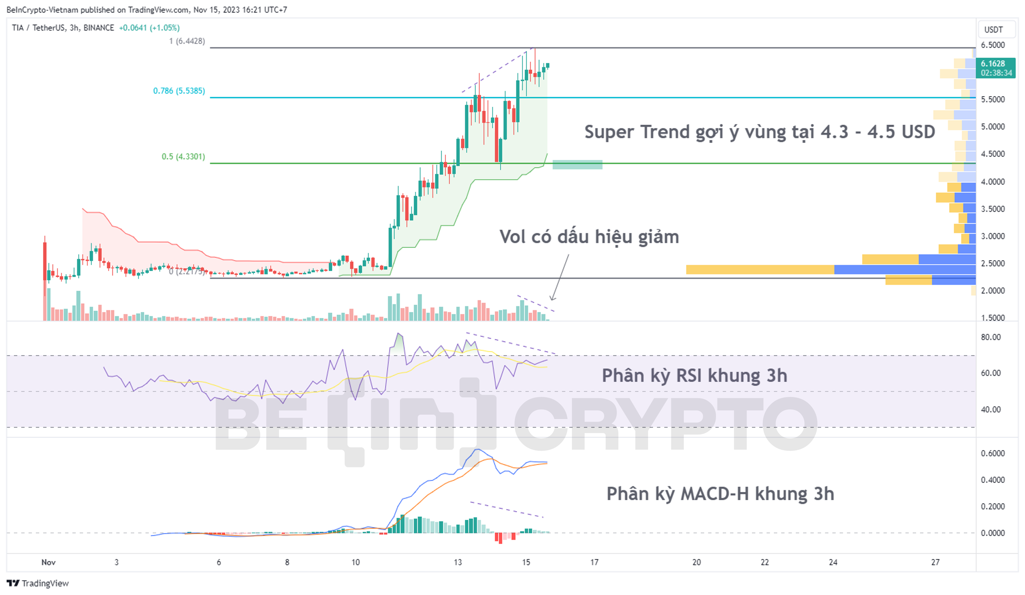- Super Trend và Fibonacci đang gợi ý vùng mua lại của TIA là 4.30 USD – 4.50 USD. Volume Profile cho biết vùng có khối lượng giao dịch đáng kể nhất của TIA vẫn là vùng giá dưới 3 USD.