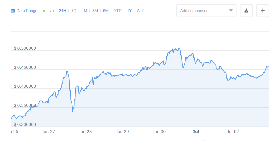Hiện tại, giá của CEL đang tăng gần 8% trong 24 giờ qua, đạt 0,462 USD. Kể từ đổ vỡ của thị trường giữa tháng 3 đến này thì CEL đã tăng hơn 800%. Chỉ trong tháng 6, token này đã tăng gần gấp đôi với 87%.