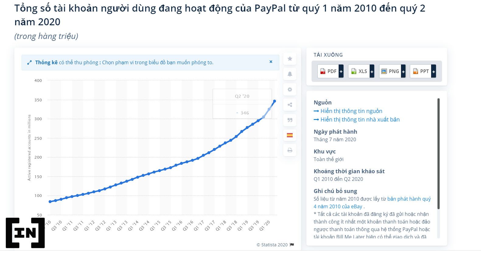 Sau khi công bố Paypal chấp nhận tiền điện tử: Bitcoin, Ethereum và Litecoin tăng mạnh. Tính đến quý II năm 2020, công ty thanh toán quốc tế này có trên 346 triệu tài khoản đang hoạt động. Đây là trang web thanh toán lớn nhất thế giới và ước tính người dùng có thể giao dịch mua bán với 26 triệu người bán vào năm 2021.