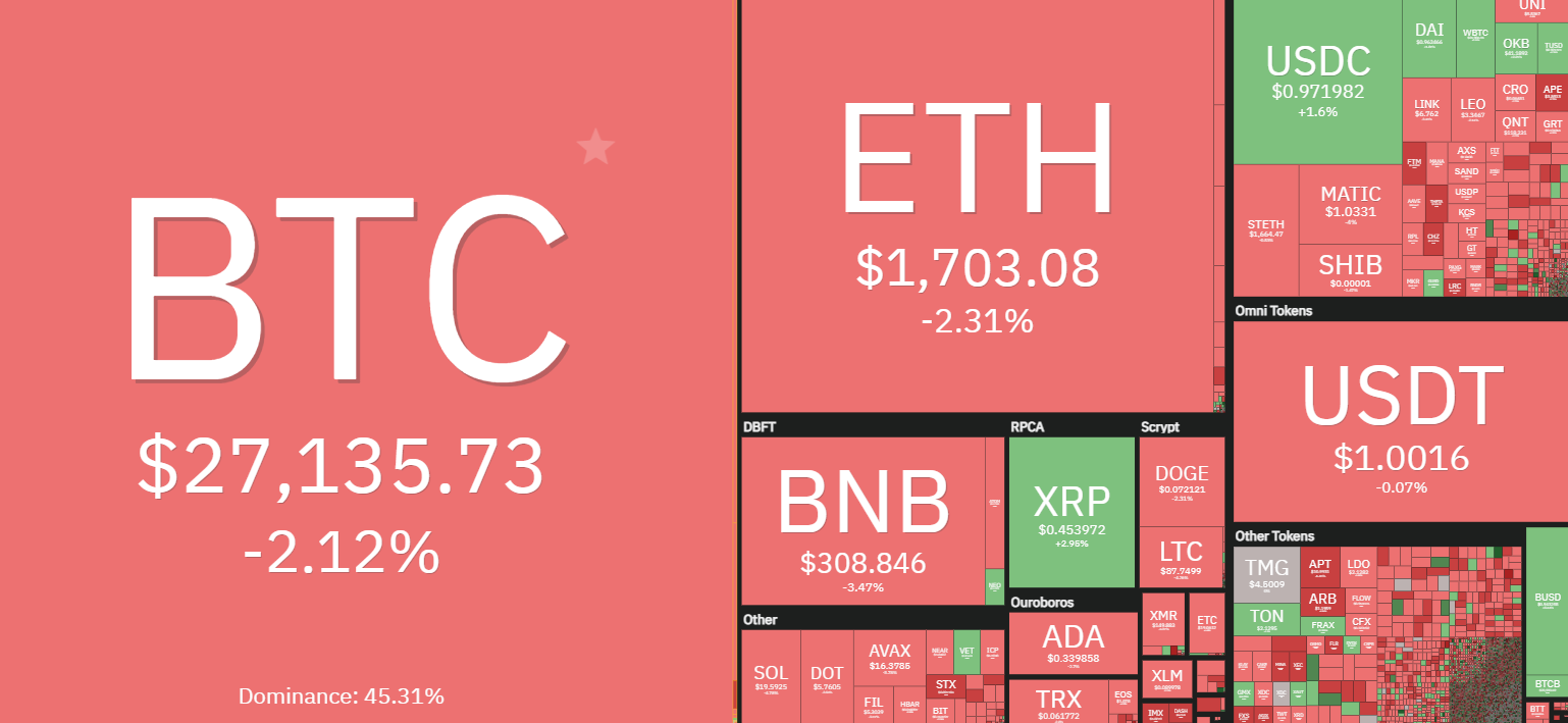 Việc CFTC Hoa Kỳ kiện Binance đã gây ra một chấn động lớn đối với thị trường tiền điện tử nói riêng. Tại thời điểm BeInCrypto thực hiện bài viết này, sắc đỏ bao trùm toàn bộ thị trường. Hai loại tiền điện tử lớn nhất theo vốn hóa thị trường là Bitcoin và Ethereum đều đã giảm điểm sau tin tức này. Trong một giờ qua, Bitcoin đã giảm xuống mức thấp nhất còn 26,720 USD và Ethereum cũng giảm xuống thấp nhất còn dưới 1,700 USD.
