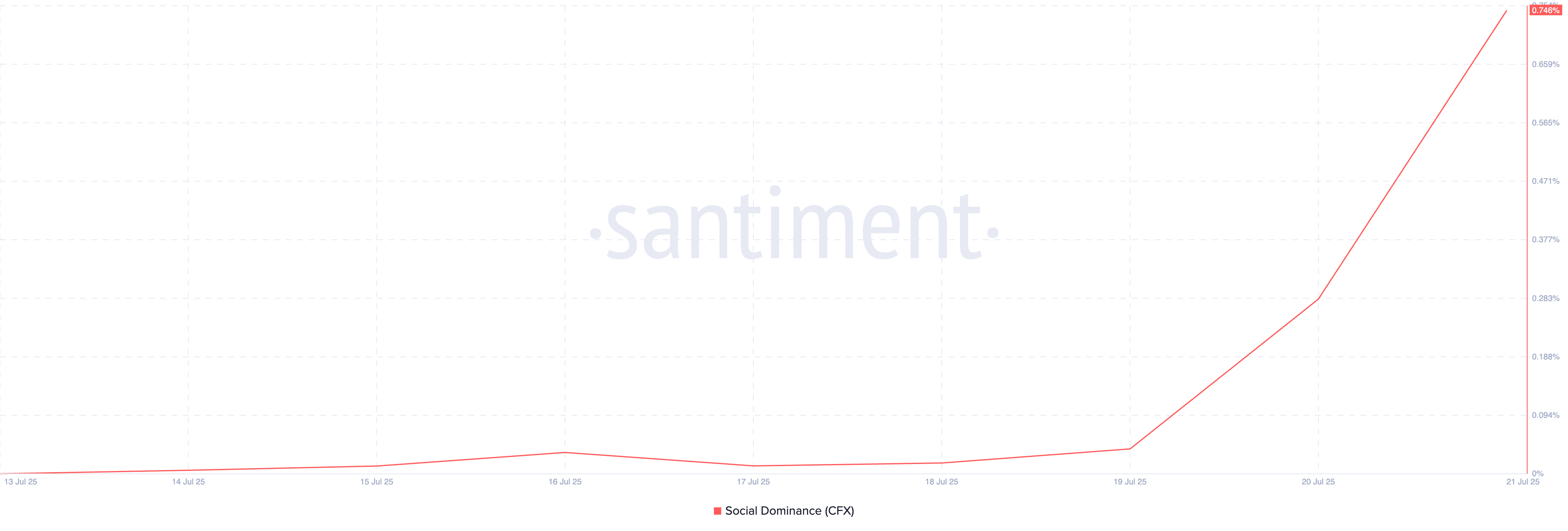 Theo Santiment, sự thống trị xã hội của CFX – một chỉ số theo dõi tỷ lệ phần trăm các cuộc thảo luận liên quan đến tiền điện tử tập trung vào tài sản này – đã tăng vọt lên mức cao nhất mọi thời đại. Theo nhà cung cấp dữ liệu on-chain, chỉ số này đạt 0.74% tại thời điểm viết bài, xác nhận sự gia tăng đáng kể trong các cuộc thảo luận trực tuyến về CFX.